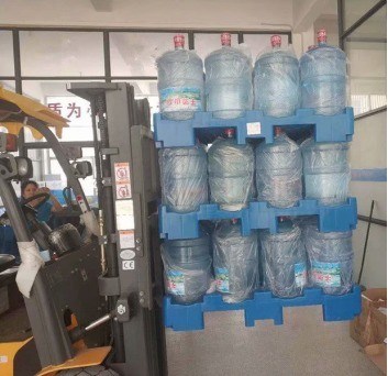 Пластиковые поддоны, специально предназначенные для транспортировки бутылок с водой объемом 19 литров.